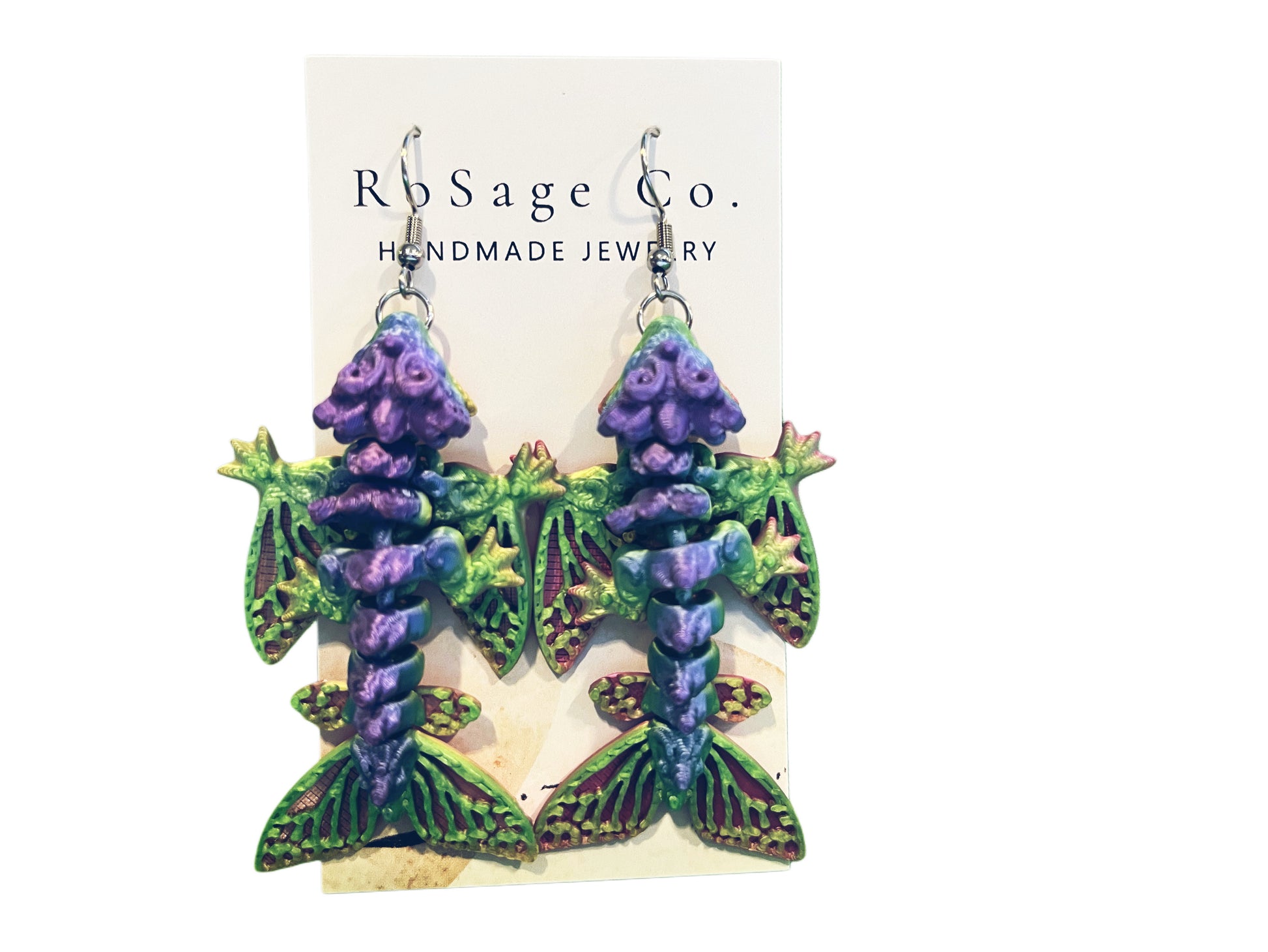 Handmade purple and green 3D printed dragon earrings.