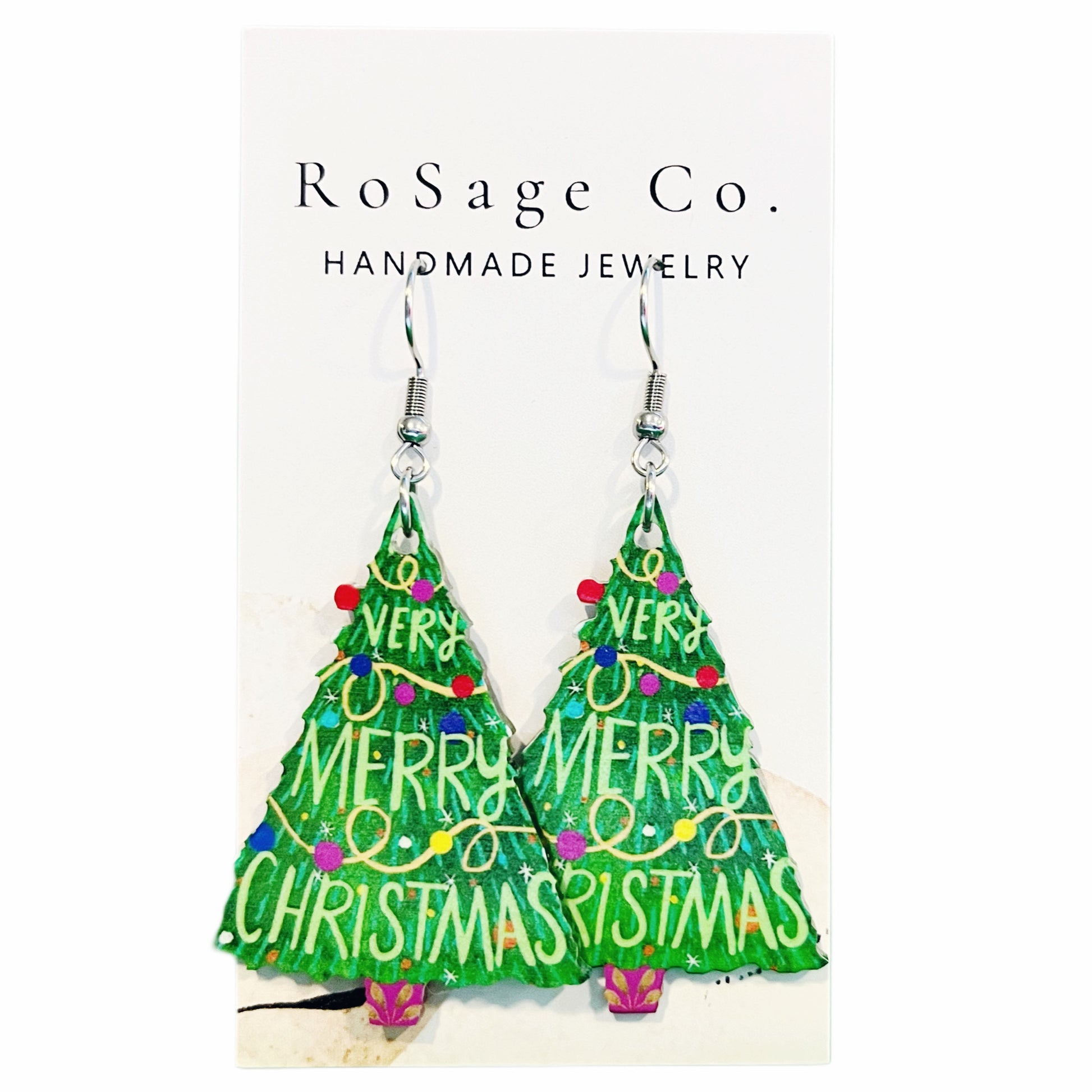 Handmade Acrylic Very Merry Christmas Tree Earrings